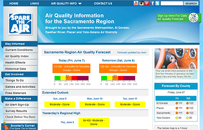 Sonoma Technology provides daily air quality forecasting, web services, and outreach support to help SMAQMD achieve its goals of protecting public health and the environment in the Sacramento region. We operate SMAQMD’s innovative Spare The Air summertime ozone and Check Before You Burn (CBYB) wintertime PM<sub>2.5</sub> forecasting programs. We also designed and operate SMAQMD’s data-rich <a href="/projects/4206" target="_blank">Spare The Air website</a> and created and maintain the Air Alert forecast and real-time email notification system. In addition, we develop ozone and PM<sub>2.5</sub> forecasting tools to produce accurate and reliable air quality forecasts. Our extensive analyses demonstrated that SMAQMD’s CBYB program effectively reduces PM<sub>2.5</sub> concentrations in the Sacramento region.