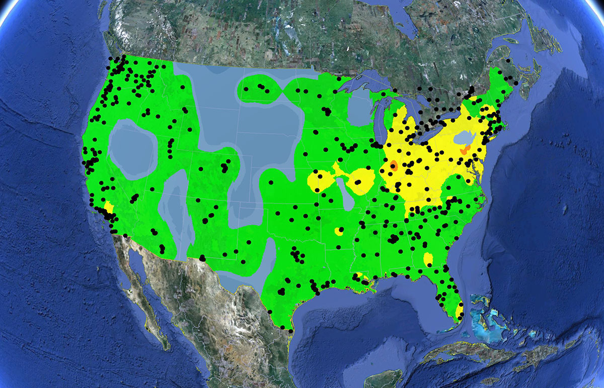 EPA’s <a href="https://www.airnow.gov/" target="_blank">AirNow program</a href> provides the public with easy access to national ambient air quality information using a health effects based scale (the AQI). AirNow presents real-time hourly AQI conditions and daily AQI forecasts by interpolating AQI levels to a grid and creating maps that cover national, regional, and local spatial scales. However, significant gaps in the coverage of ground-based PM<sub>2.5</sub>, ozone, and NO<sub>2</sub> monitors prevent complete nationwide mapping of pollutant concentrations in the United States. When interpolated and contoured, AQI levels in regions far from monitors may have higher uncertainty.</p>